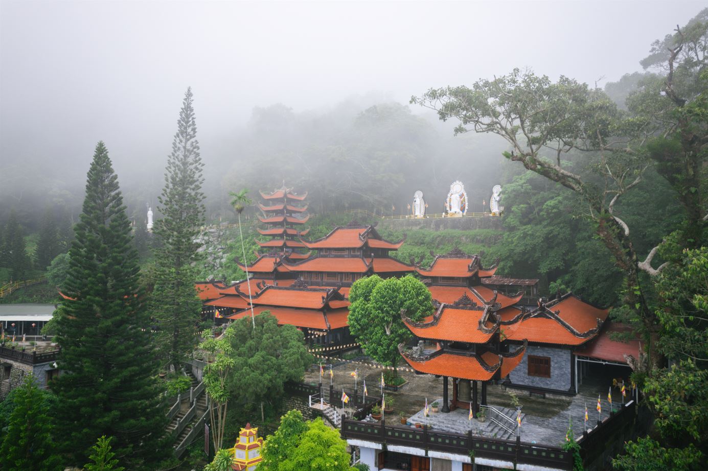 Chùa Linh Sơn Trường Thọ đầy huyền hoặc giữa màn sương sớm.