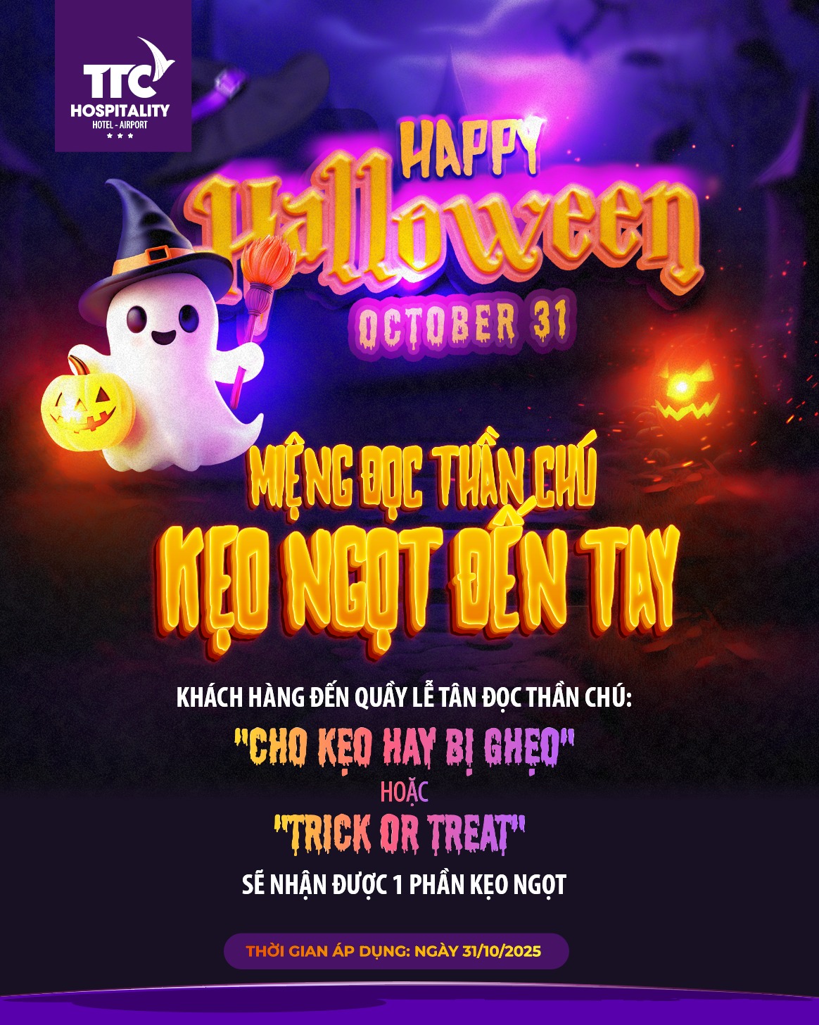 Đừng quên hóa trang thật “ngầu” – phù thủy, ma cà rồng hay bí ngô nghịch ngợm – để cùng TTC Hotel – Airport tạo nên một Halloween thật vui nhộn và rộn ràng tiếng cười!