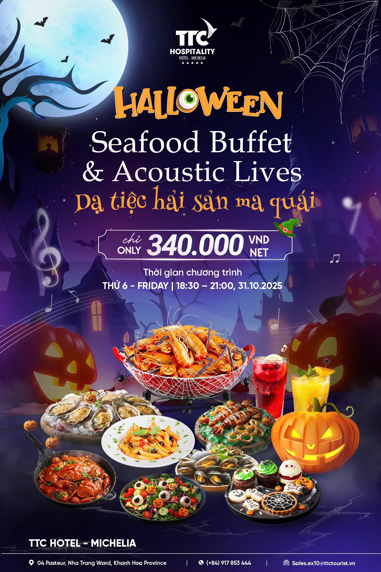 Đặc biệt, đêm tiệc “Halloween Seafood Buffet & Acoustic Live” sẽ diễn ra vào ngày 31.10.2025 – nơi ẩm thực hải sản hòa cùng âm nhạc mộc mạc, hứa hẹn mang lại một Halloween đáng nhớ.