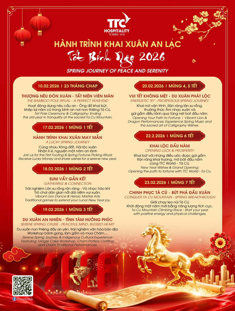 Chào mừng Tết Bính Ngọ 2026, TTC Hospitality chính thức khởi động chương trình “Hội tụ Chiến Mã – Quà xuân cực đã” dành cho Quý khách hàng lưu trú và tham quan các khu vui chơi thuộc hệ thống TTC Hospitality.