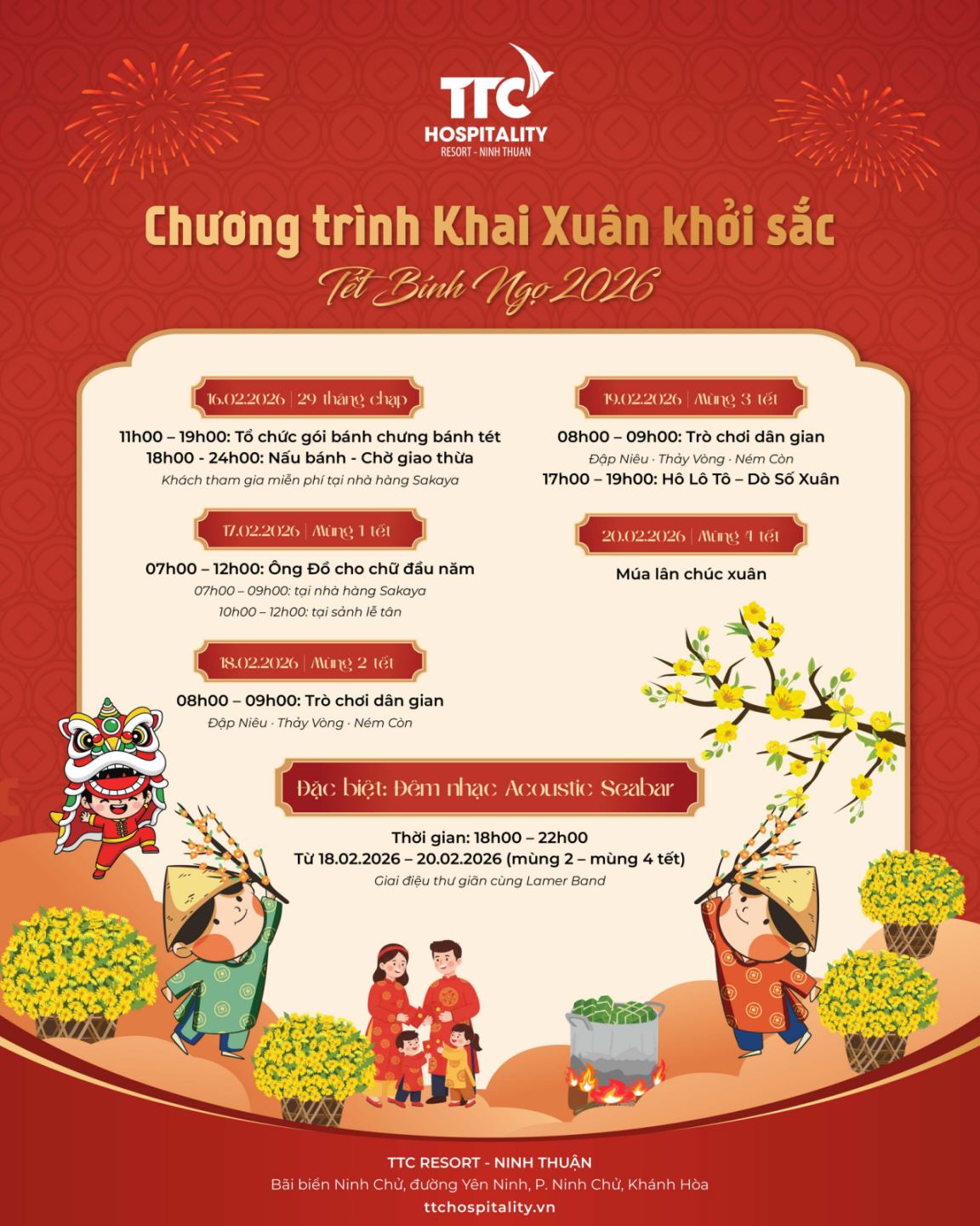 Tại TTC Resort – Ninh Thuận, không khí Tết được khẽ lan tỏa qua chuỗi hoạt động mang đậm giá trị văn hóa, nơi du khách cùng nhau đón xuân trong sự thư thái, rộn ràng vừa đủ và trọn vẹn niềm vui.