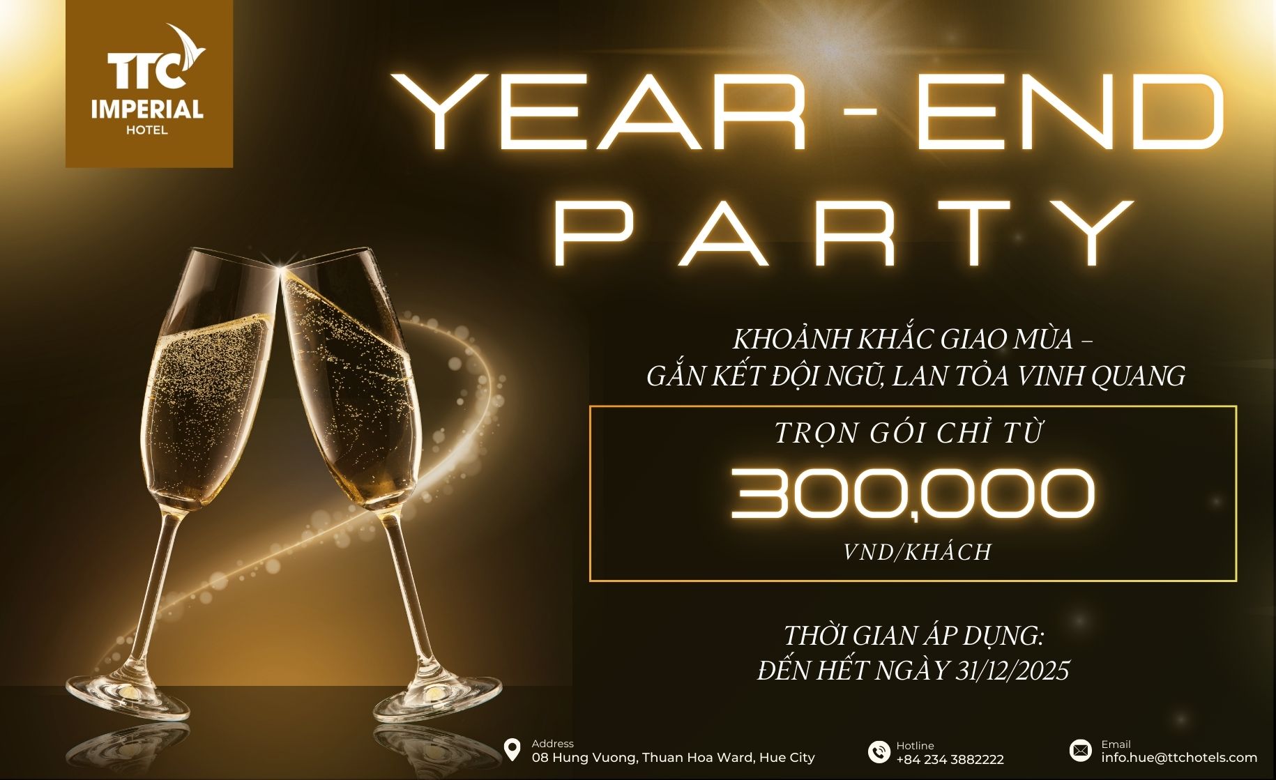 Khép lại một năm rực rỡ bằng bữa tiệc tri ân đầy cảm xúc tại TTC Imperial Hotel – nơi mỗi khoảnh khắc đều được nâng tầm với không gian sang trọng, dịch vụ chuẩn mực và những ưu đãi đặc biệt dành riêng cho doanh nghiệp.