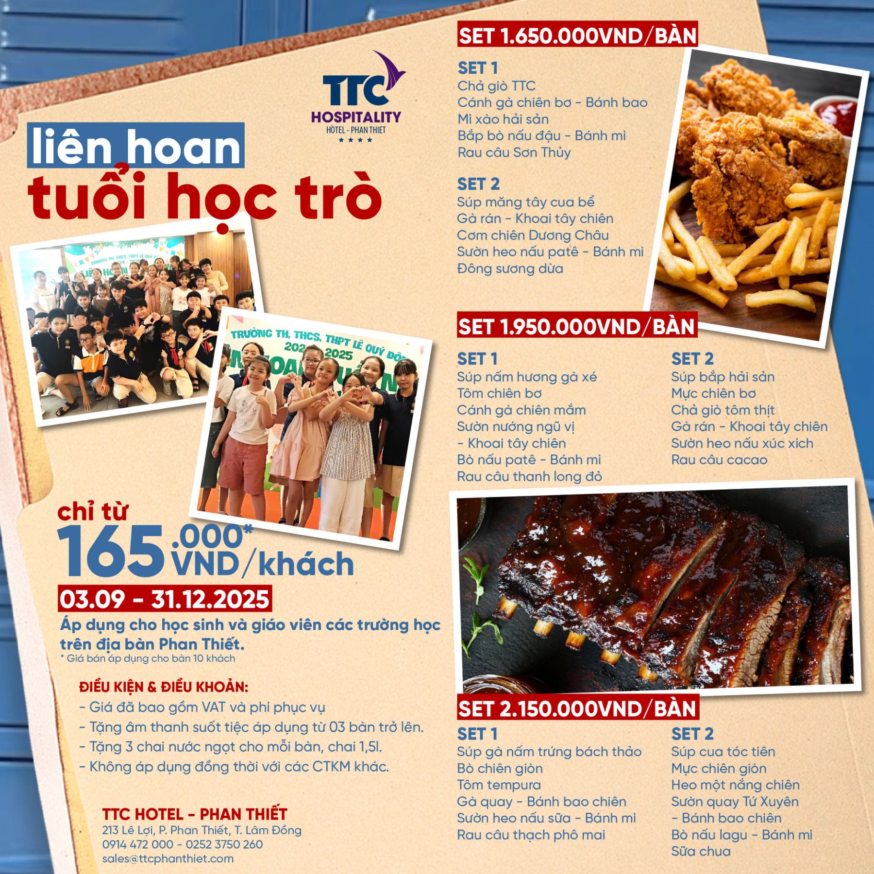 Mùa tựu trường không chỉ là khởi đầu năm học mới mà còn là dịp để thầy cô và học sinh cùng nhau lưu giữ những kỷ niệm đáng nhớ. Và năm nay, TTC Hotel – Phan Thiết mang đến chương trình Liên hoan tuổi học trò – vừa vui vừa “hời” với mức giá chỉ từ 165.000đ/khách.
