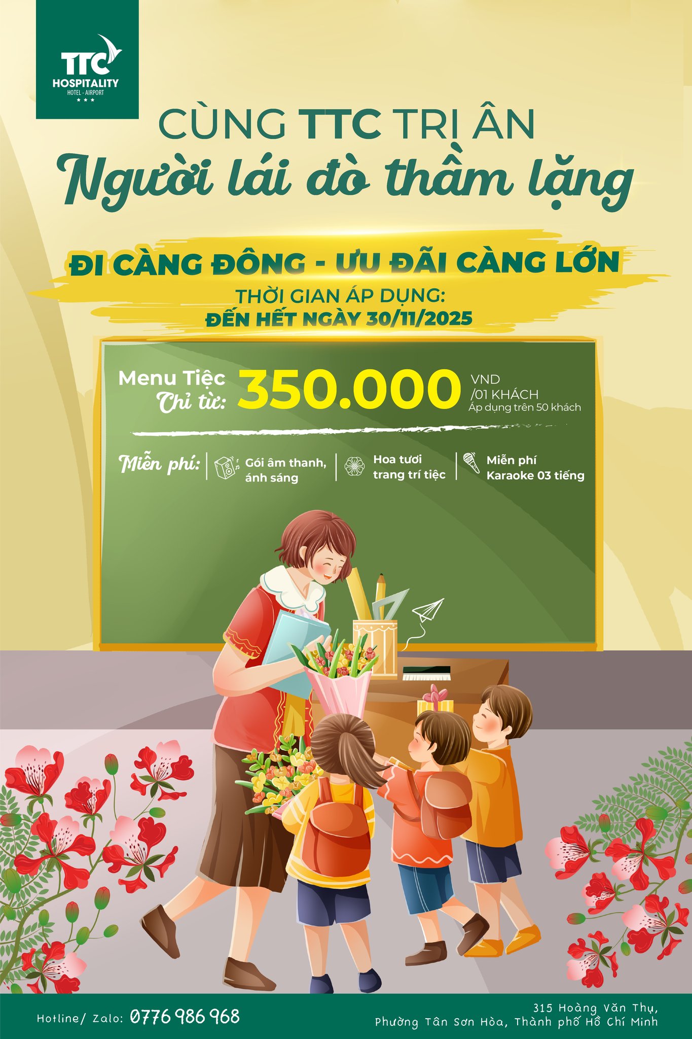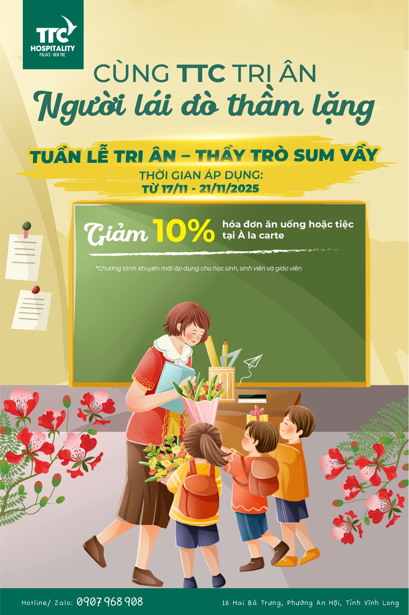 Hãy để TTC Hospitality đồng hành cùng Quý Thầy Cô trong ngày kỷ niệm đặc biệt này — nơi từng không gian được chăm chút bằng sự trân trọng và từng món ăn là lời cảm ơn chân thành.