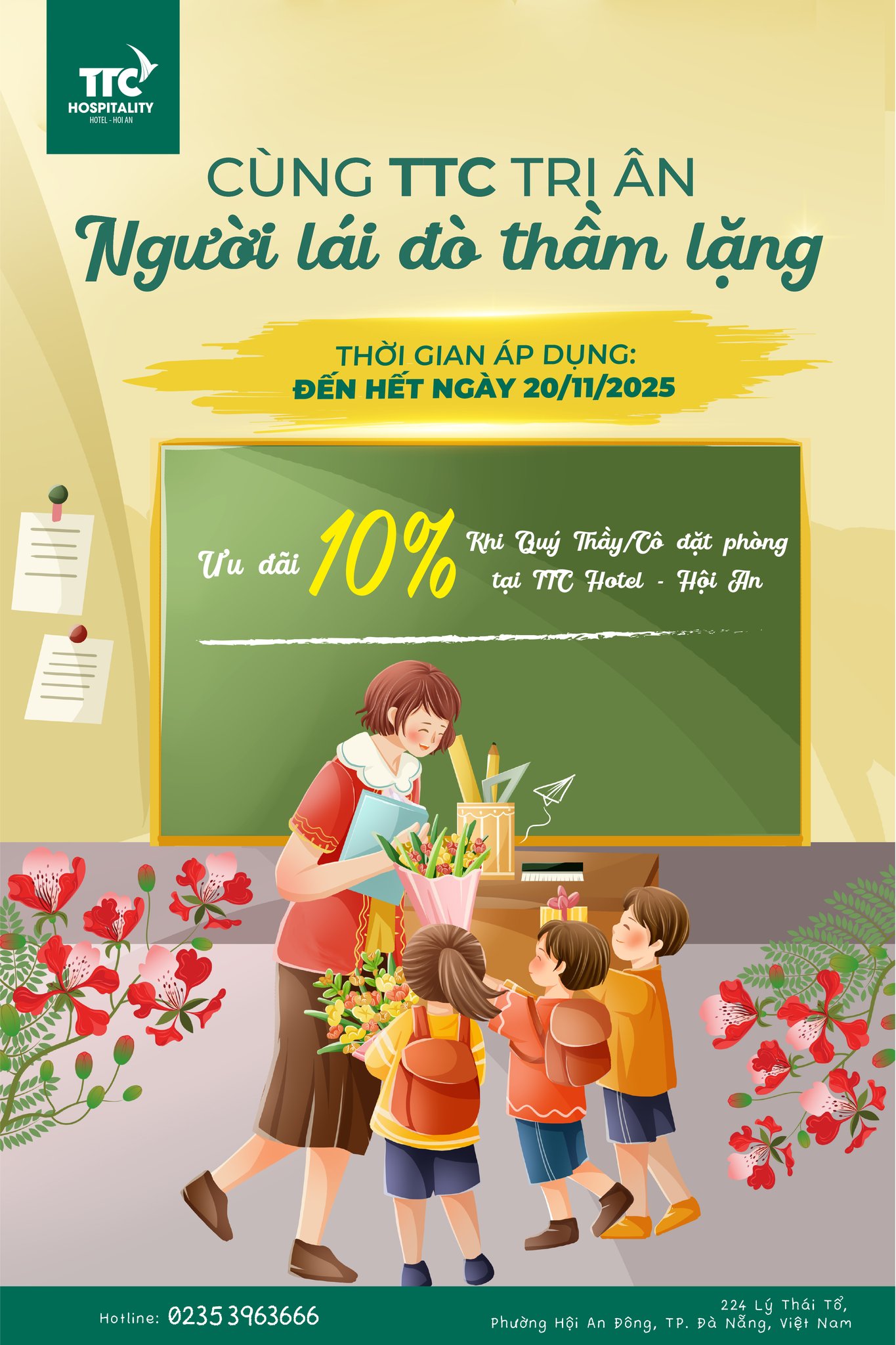 TTC Hotel - Hội An dành tặng ưu đãi 10% khi Quý Thầy Cô đặt phòng nghỉ dưỡng – như một món quà nhỏ để gửi gắm lòng biết ơn. Hãy để TTC Hotel – Hội An mang đến cho quý thầy cô những ngày nghỉ thật nhẹ nhàng, giữa không gian phố Hội thanh bình.