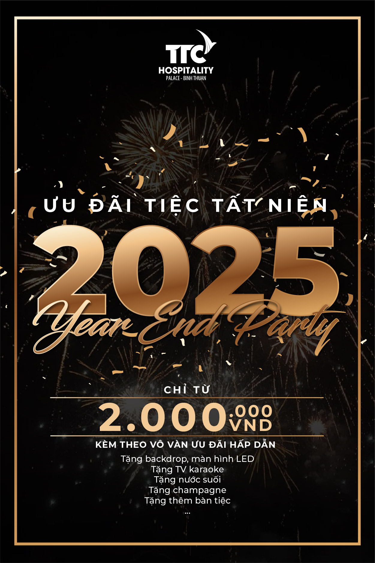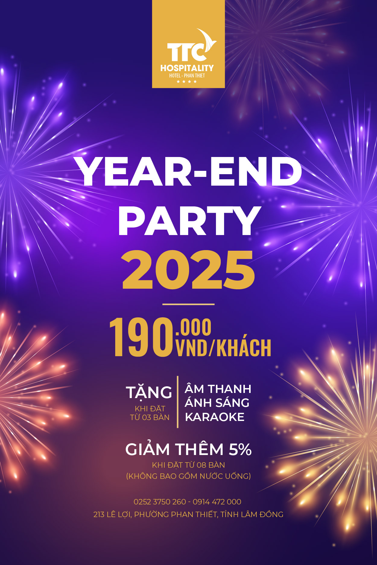 Khép lại một năm thật rực rỡ cùng ưu đãi Year End Party 2025 tại TTC Hotel - Phan Thiết, với mức giá hấp dẫn và nhiều quyền lợi đi kèm dành cho doanh nghiệp, nhóm bạn và các buổi tiệc tổng kết.