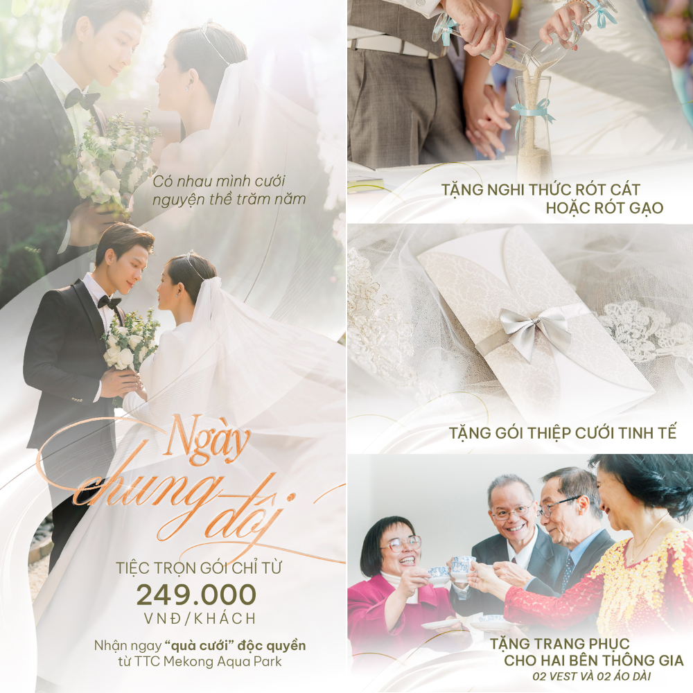 Có những khoảnh khắc chỉ đến một lần trong đời, và ngày cưới chính là một dấu mốc thiêng liêng như thế. Tại TTC Mekong Aqua Park, chúng tôi mong muốn biến ngày đặc biệt ấy thành một kỷ niệm vẹn tròn, nơi không chỉ có bữa tiệc sum vầy, mà còn là cảm xúc được nâng niu trong từng chi tiết.