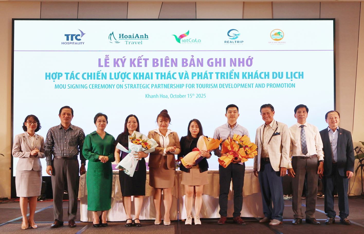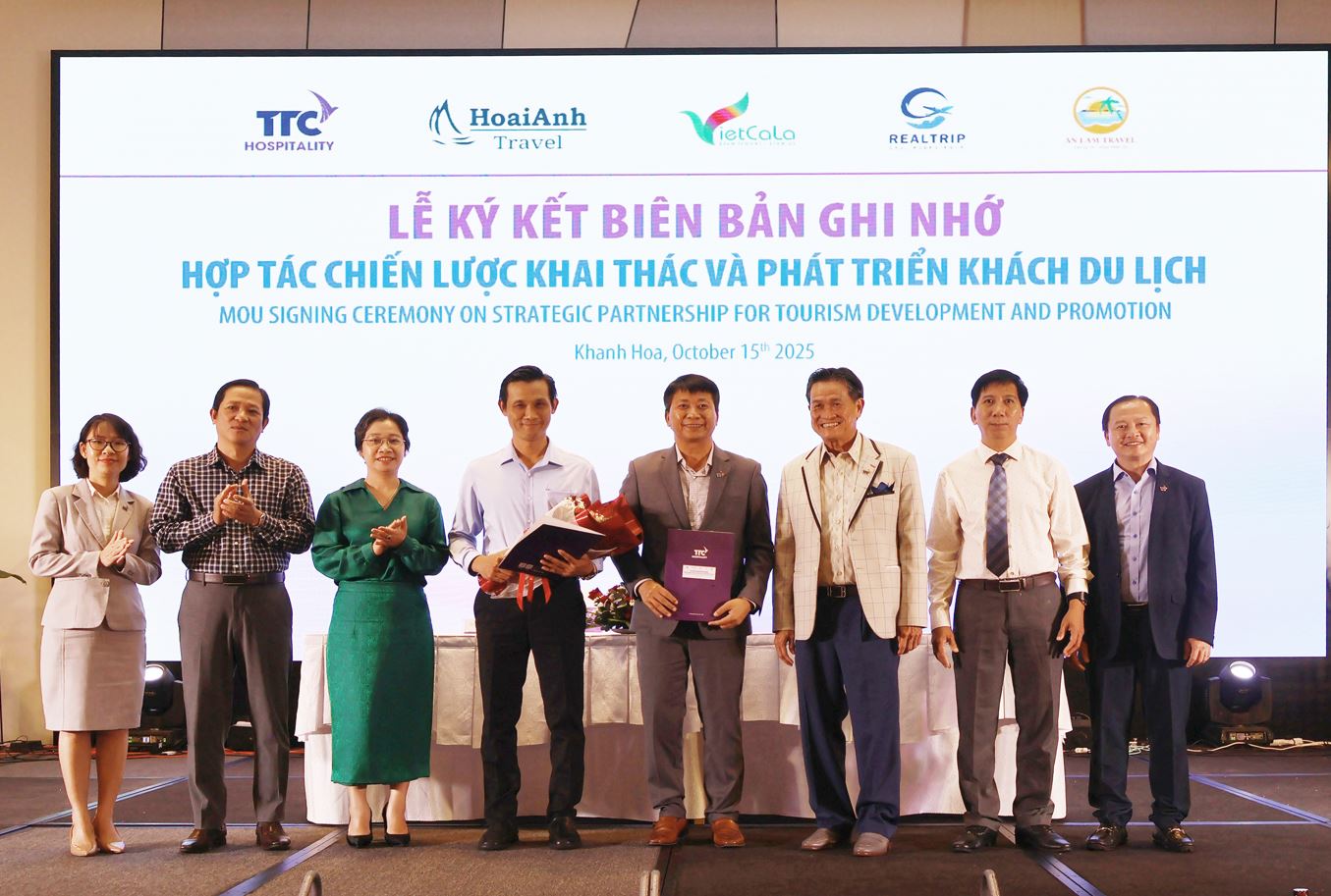 Ông Cung Quỳnh Anh – Phó Giám đốc Sở Văn hóa, Thể thao và Du lịch tỉnh Khánh Hòa (thứ ba từ trái sang), Ông Võ Nam Thắng – Tỉnh ủy viên, Bí thư Đảng ủy phường Đông Ninh Hòa (thứ năm từ trái sang), cùng Ông Đặng Văn Thành – Chủ tịch Tập đoàn TTC (giữa) cùng Ban Lãnh đạo TTC Hospitality tại sự kiện.