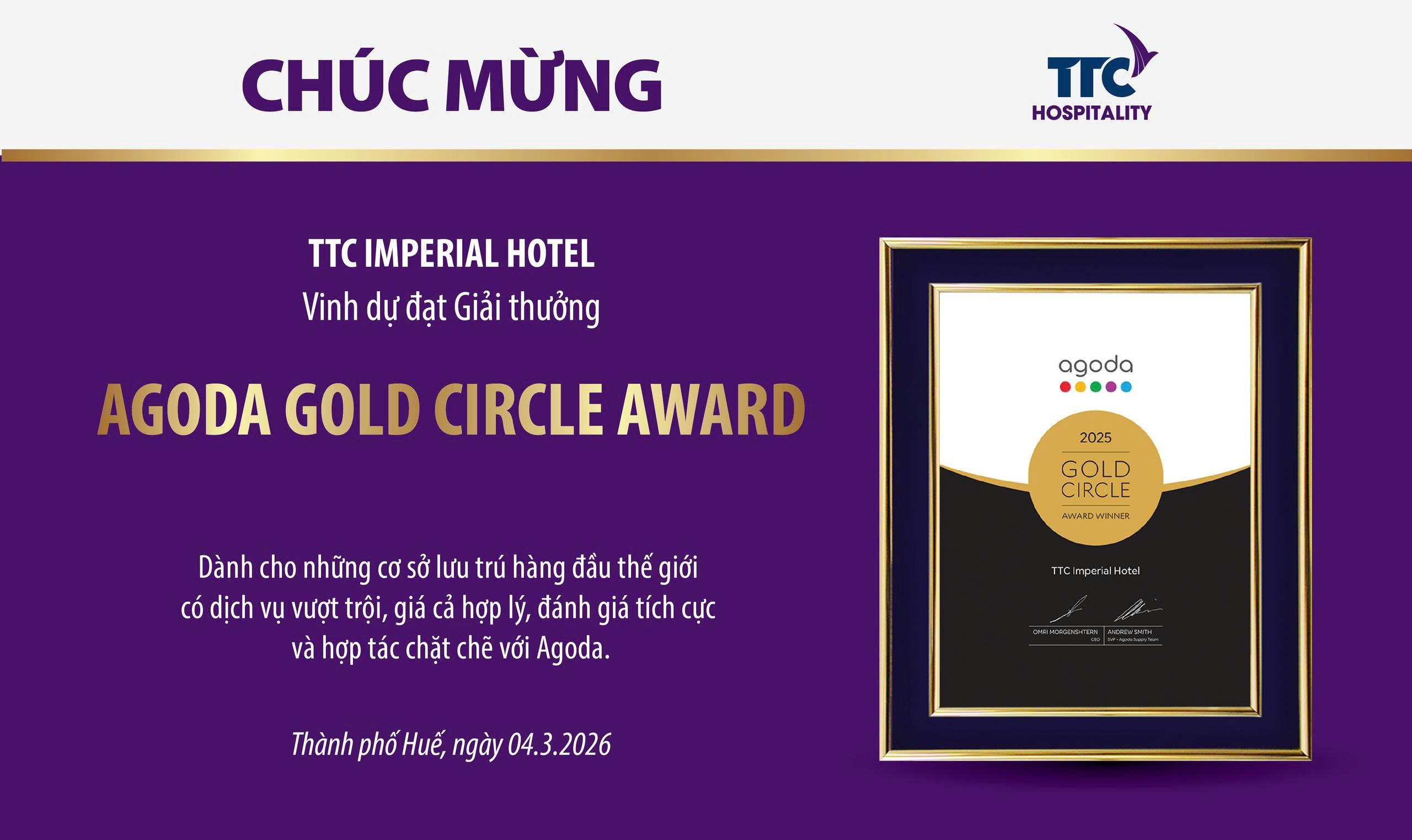 TTC Imperial Hotel vinh dự nhận giải thưởng Traveller Review Awards 2026 của Booking.com - nền tảng du lịch trực tuyến cung cấp hơn 28 triệu đăng ký điểm lưu trú trên toàn thế giới.